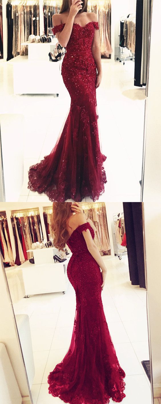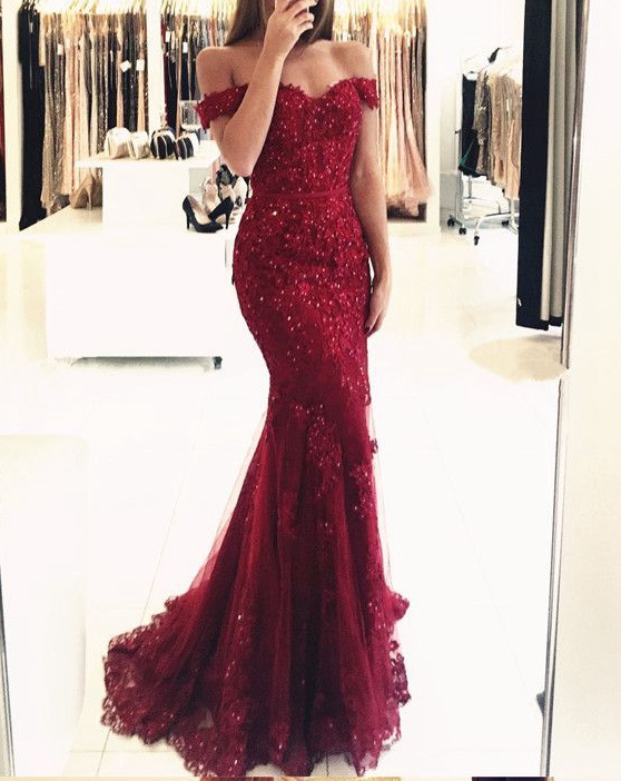Burgundy Appliques Mermaid Prom Dress, Beaded Tulle Off the Shoulder Prom Dresses with Sweep Train, Formal Evening Dresses, Wedding Party Dresses, 017