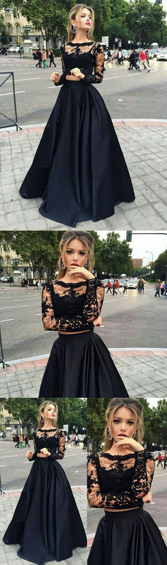 Black Lace Long Sleeves Prom Dress, 2 Pieces Satin Prom Dresses, Formal Evening Dresses, Wedding Party Dress,018