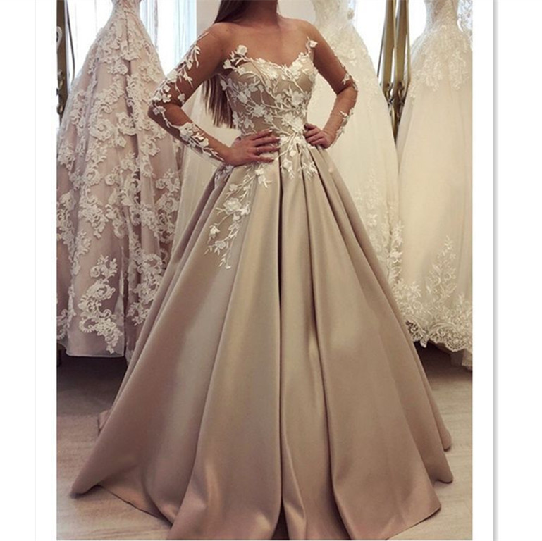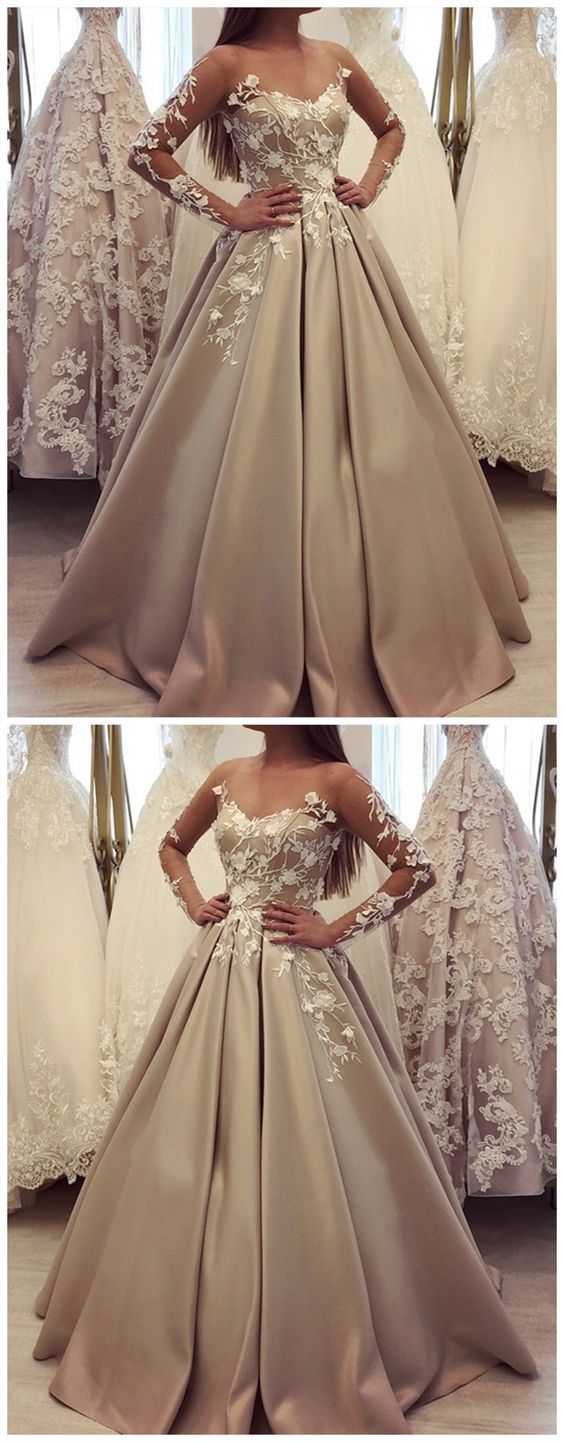 Long Sleeves Illusion Neckline Prom Dress, Lace Appliques Ball Gown Prom Dresses, Formal Evening Dresses, Wedding Party Dress,041