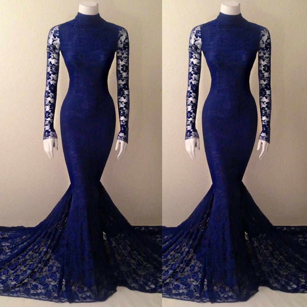 Royal Blue High neck Long Sleeves Prom Dress,Lace Mermaid Prom Dresses, Formal Evening Dresses, Wedding Party Dress, 065