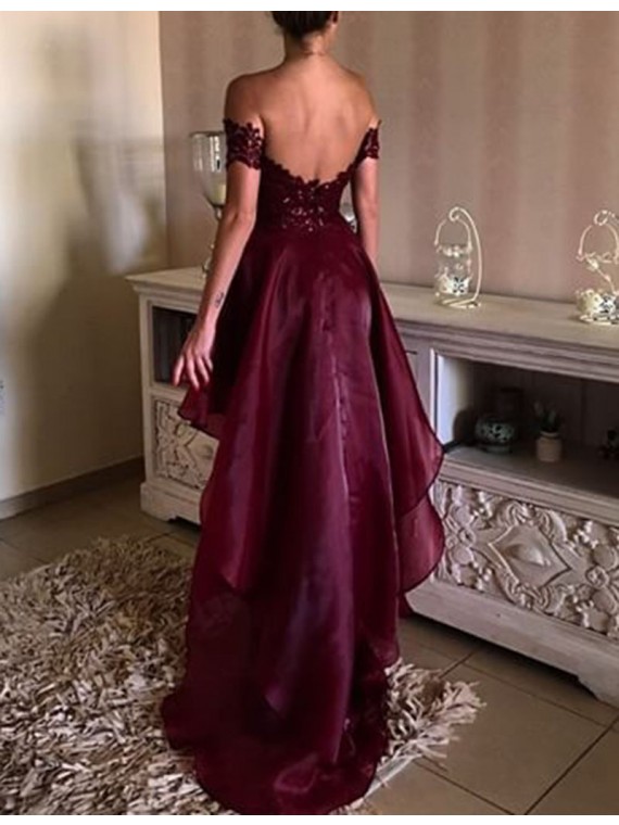 Burgundy Sequins Appliques Organza Prom Dress, Off the Shoulder High Low Prom Dresses, Formal Evening Dresses, Wedding Party Dress, 102