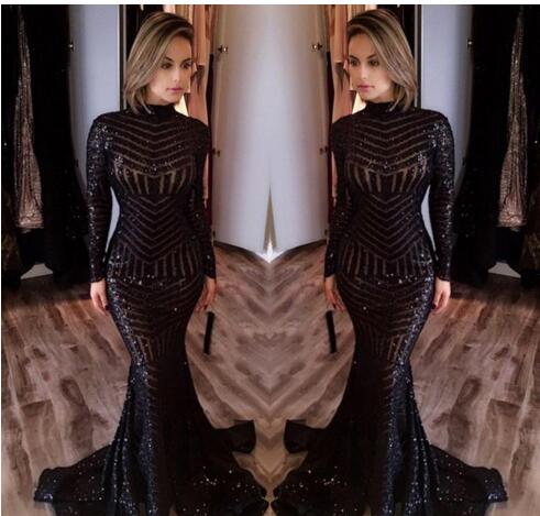 Charming Black Sequins Prom Dress, Long Sleeves High neck Mermaid Prom Dresses, Wedding Party Dress, Evening Party Gowns, 117