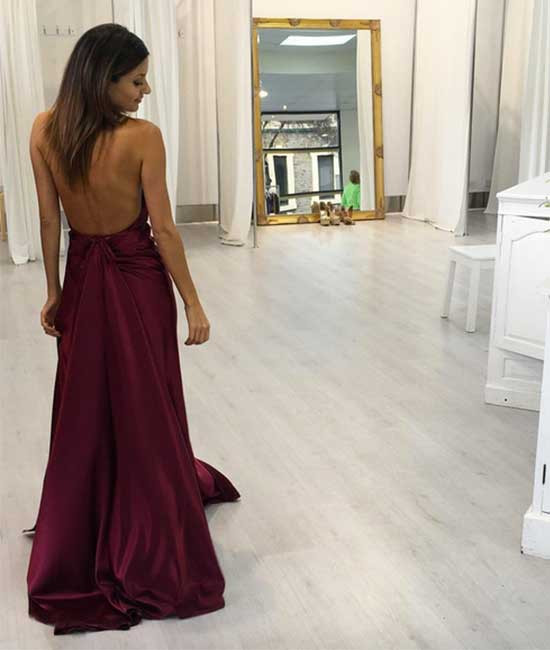 Burgundy V neck Halter Prom Dress, Backless Satin Split Prom Dresses, Wedding Party Dress, Evening Party Gowns, 132