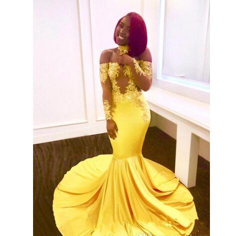 African Ladies Mermaid Prom Dress, Yellow Appliques Off the Shoulder Prom Dresses, Wedding Party Dress, Evening Party Gowns, 153