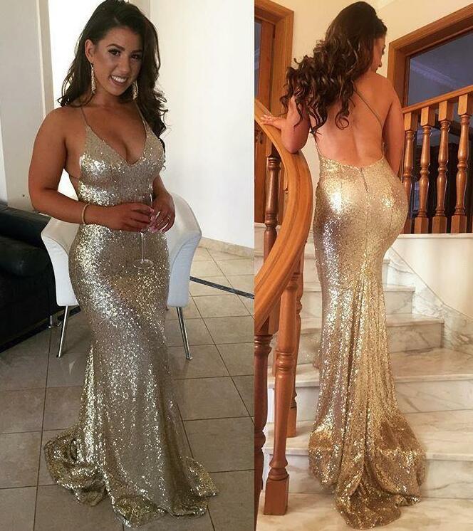 Gold Sequins Mermaid Prom Dress, Spaghetti straps Backless Prom Dresses, Wedding Party Dress, Evening Party Gowns, Wedding Guest Dresses, 205