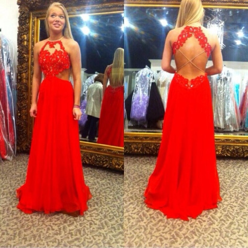 Red Appliques Prom Dress, A line Chiffon Backless Prom Dresses, Wedding Party Dress, Evening Party Gowns, Wedding Guest Dresses, 210