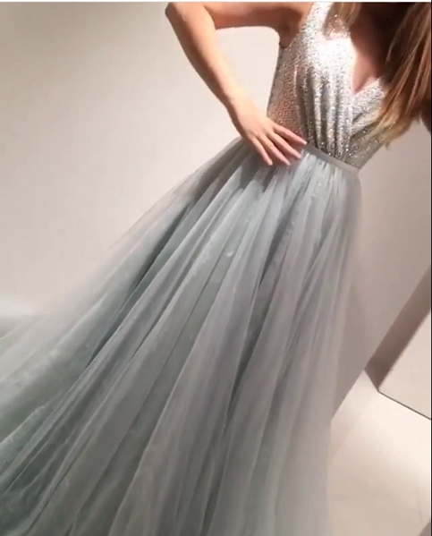 Grey A Line Sequins Prom Dress, V neck Tulle Prom Dresses, Wedding Party Dress, Evening Party Gowns, 270