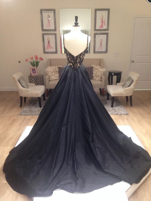 Black V neck Prom Dress, Lace Spaghetti straps Satin Prom Dresses with Train, Wedding Party Dress, Evening Party Gowns, 289
