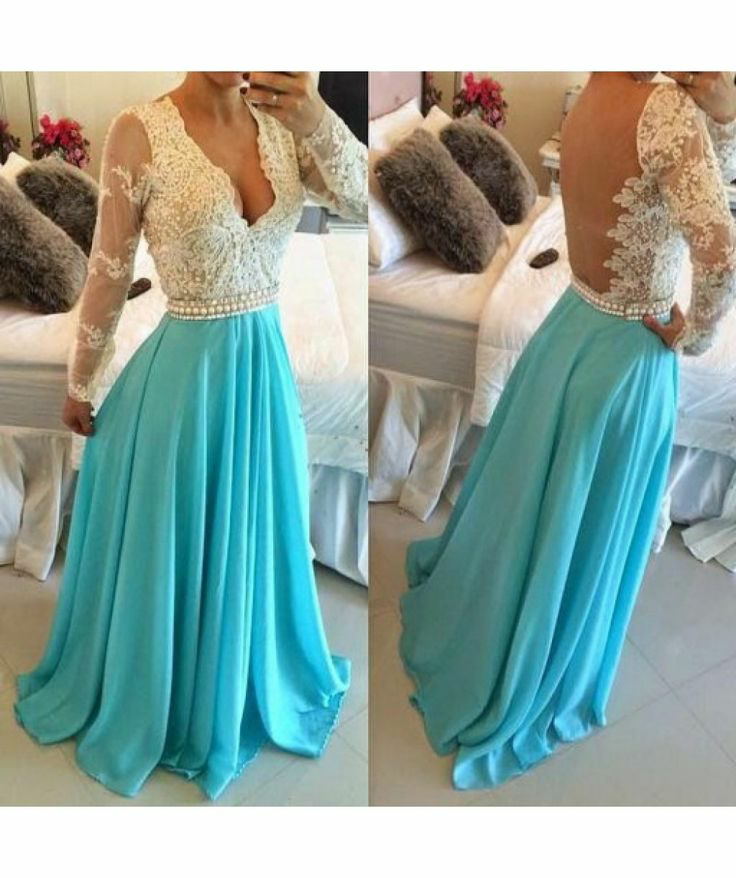 A-Line Lace Deep V-Neck Prom Dresses,Long Sleeves Pearls Sash Evening Dresses,Backless Evening Prom Dresses,Prom Gowns, 291