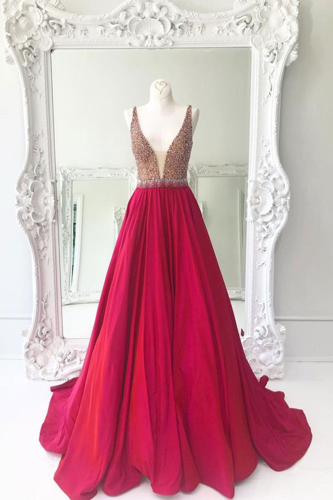 Red Beading Prom Dress, V neck Satin Prom Dresses, Wedding Party Dress, Evening Party Gowns, Wedding Guest Dresses, 304