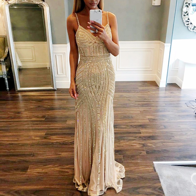 Champagne Sequins Mermaid Prom Dress, Spaghetti straps Prom Dresses, Wedding Party Dress, Evening Party Gowns, Wedding Guest Dresses, 305