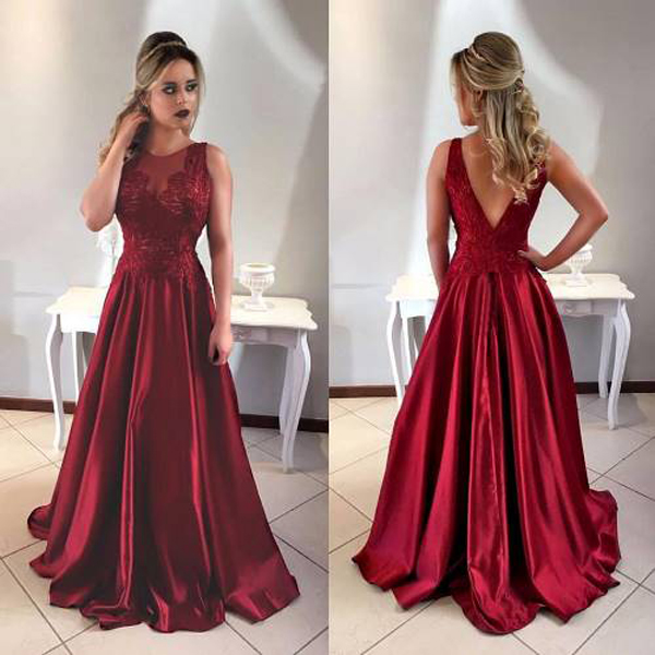 Burgundy Satin Prom Dress, Appliques V Back Prom Dresses, Wedding Party Dress, Evening Party Gowns, Wedding Guest Dresses, 315