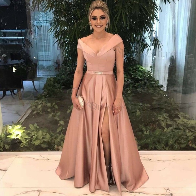 Blush Pink Off the Shoulder Prom Dress, V neck Split Satin Prom Dresses, Wedding Party Dress, Evening Party Gowns, Wedding Guest Dresses, 322