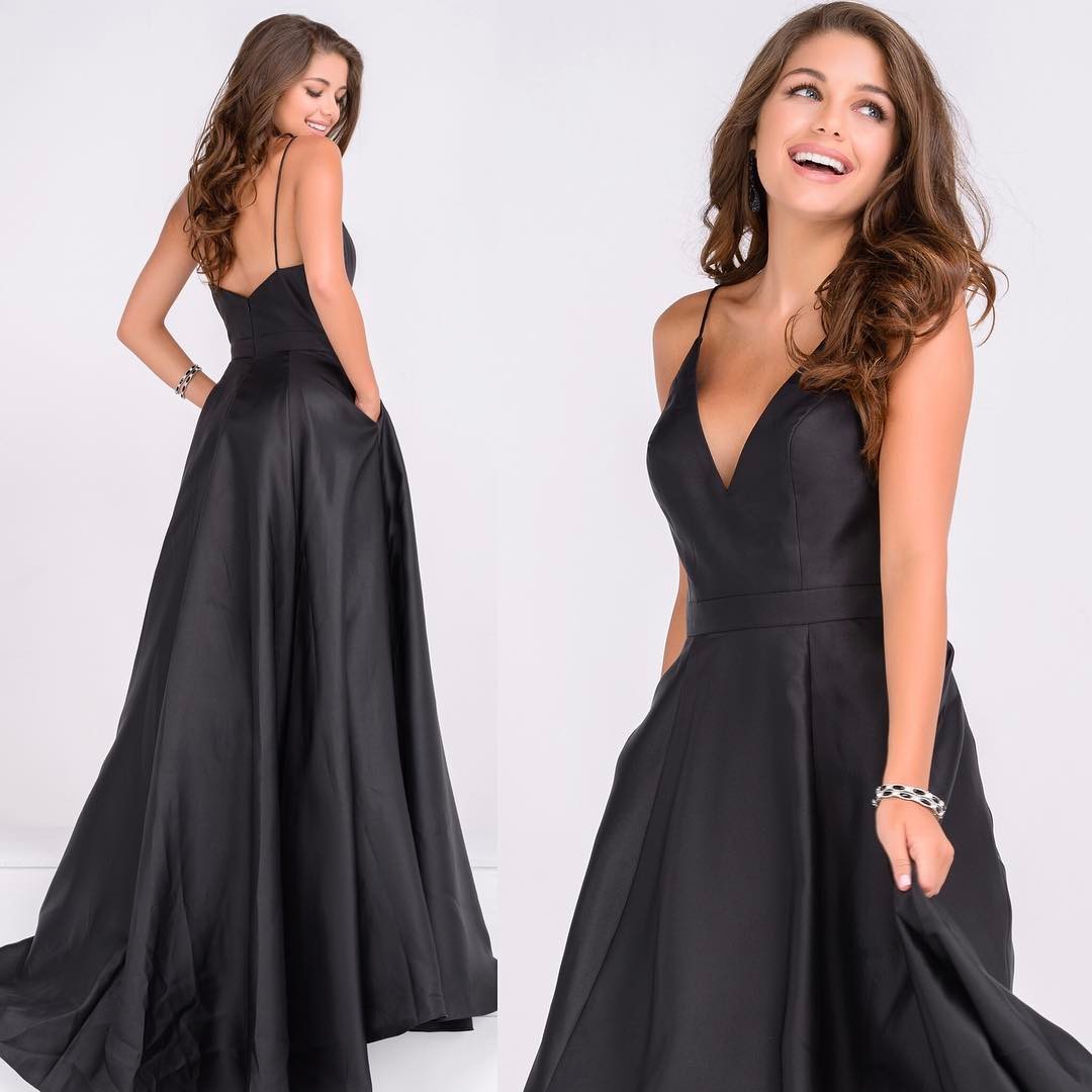 Black Spaghetti straps Prom Dress with Pockets, Open Back Satin Prom Dresses, Wedding Party Dress, Evening Party Gowns, Wedding Guest Dresses, 333