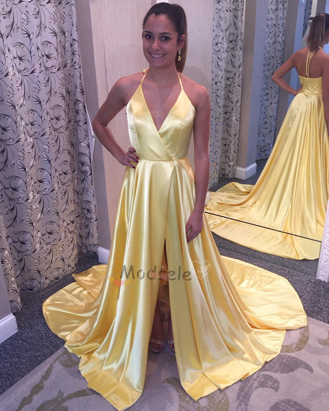 Halter Open Back Prom Dress, Split V neck Satin Prom Dresses, Wedding Party Dress, Evening Party Gowns, Wedding Guest Dresses, 340