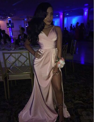 Pink V neck Side Slit Prom Dress, Pleat Satin Prom Dresses, Wedding Party Dress, Evening Party Gowns, Wedding Guest Dresses, 351