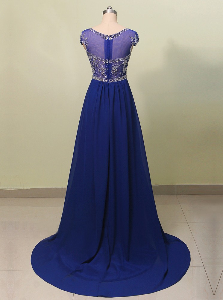 Royal Blue Cap Sleeves Beading Prom Dress, Satin Prom Dresses with Train, Wedding Party Dress, Evening Party Gowns, Wedding Guest Dresses, 359