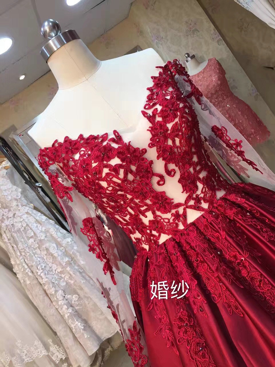 Red Long Sleeves Prom Dress, Off the Shoulder Appliques Beading Prom Dresses, Ball Gown Satin Prom Gowns, Evening Party Gowns, 360