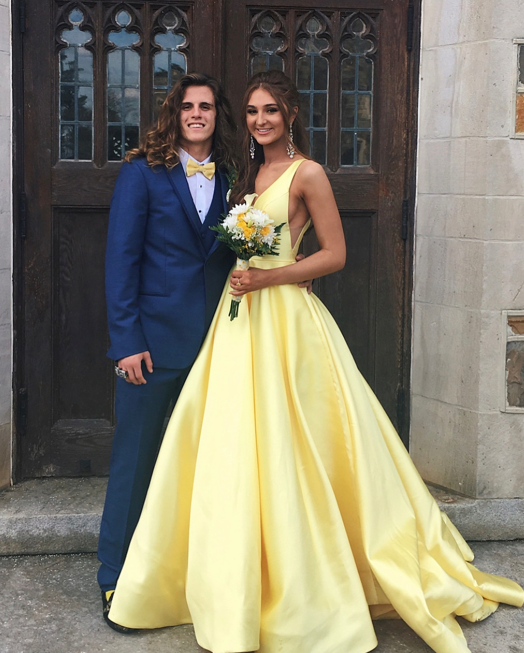 Yellow V neck Satin Prom Dresses, Wedding Party Gowns with Train, Evening Party Gowns, Wedding Guest Dresses, 461