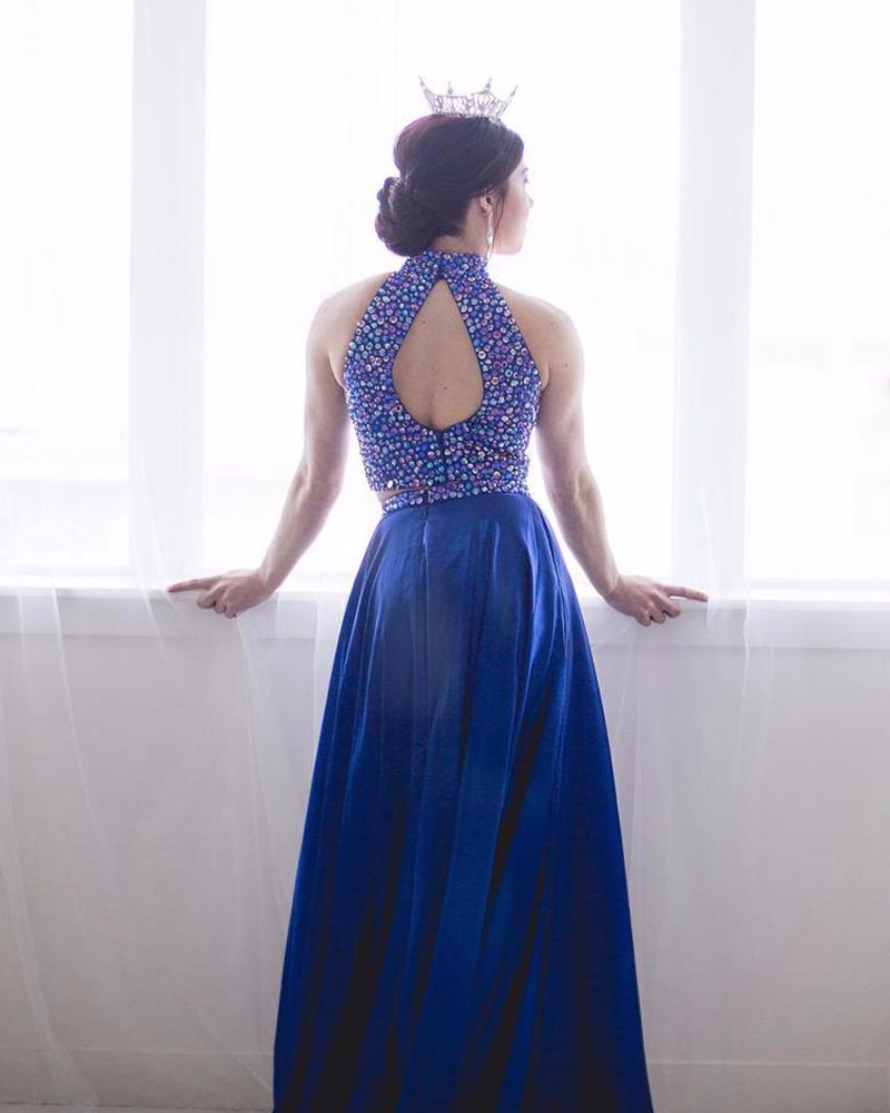 Charming Long Elegant High Neck Two Piece Royal Blue Prom Dresses,Halter Beaded Prom Dresses, 477