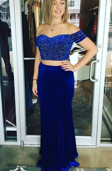 Two Piece Off-the-Shoulder Swewep Train Royal Blue Velvet Prom Dress with Beading, 532