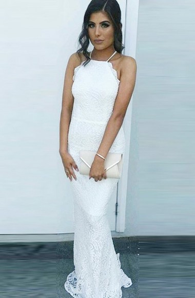 Mermaid Crew Sweep Train White Lace Criss-Cross Straps Prom Dress, 538