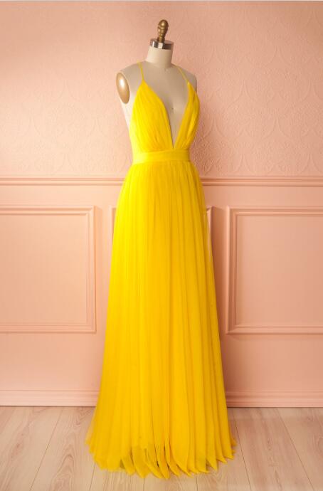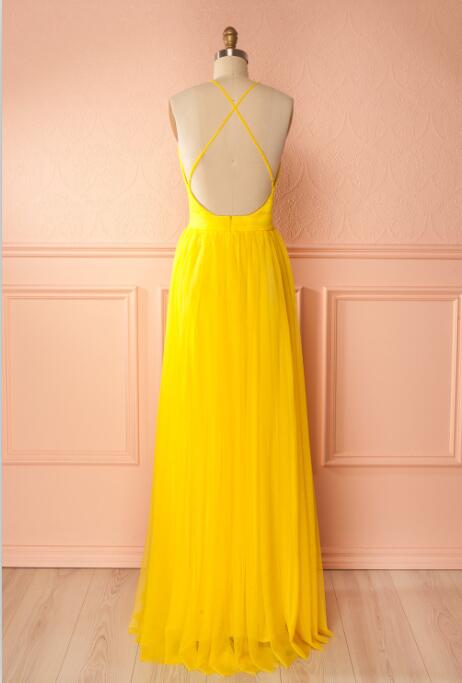Yellow A Line Tulle Prom Dress,Long Evening Dress,Spaghetti Strap Formal Dresses, 587