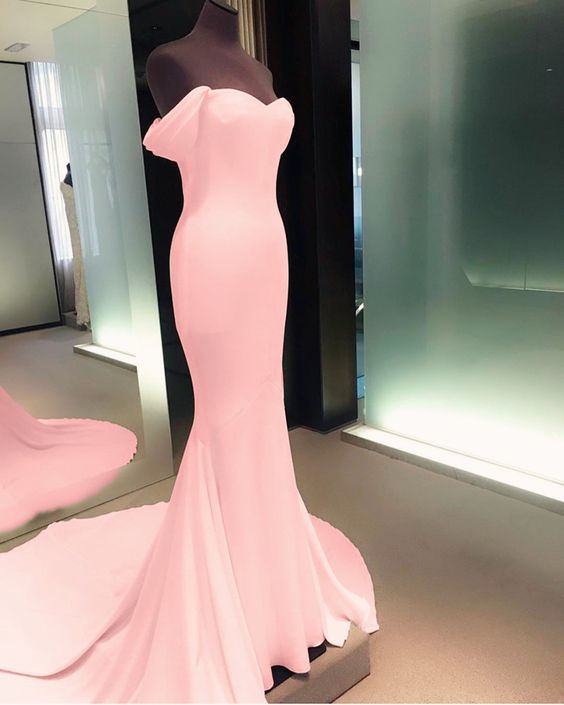 Pink Off Shoulder Sweep Train Satin Prom Dresses, 591