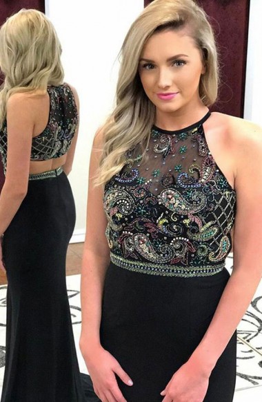 Memraid Crew Sweep Train Black Stretch Satin Open Back Prom Dress with Beading, 614