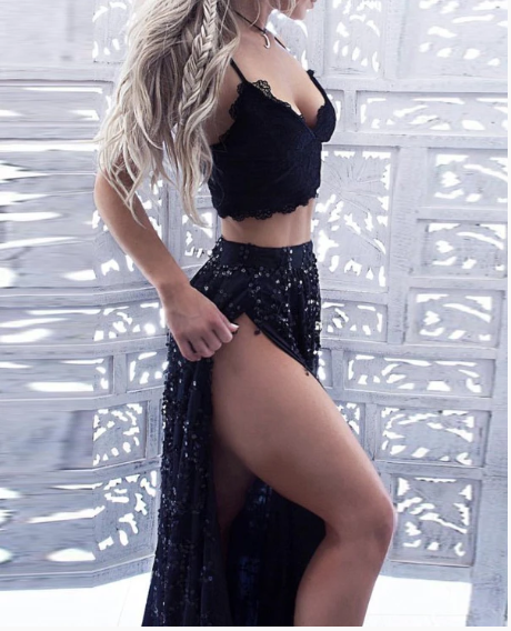 Two Piece Spaghetti Straps High Split-Side Black Sequined Appliques Prom Dresses, 650