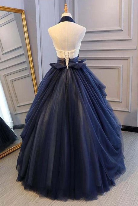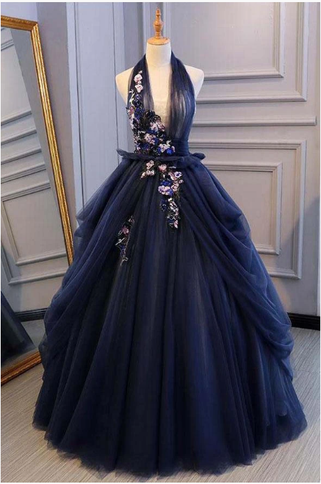 Ball Gown Blue Tulle Lace Long Prom Dresses Deep V Neck Backless Evening Dresses, 655