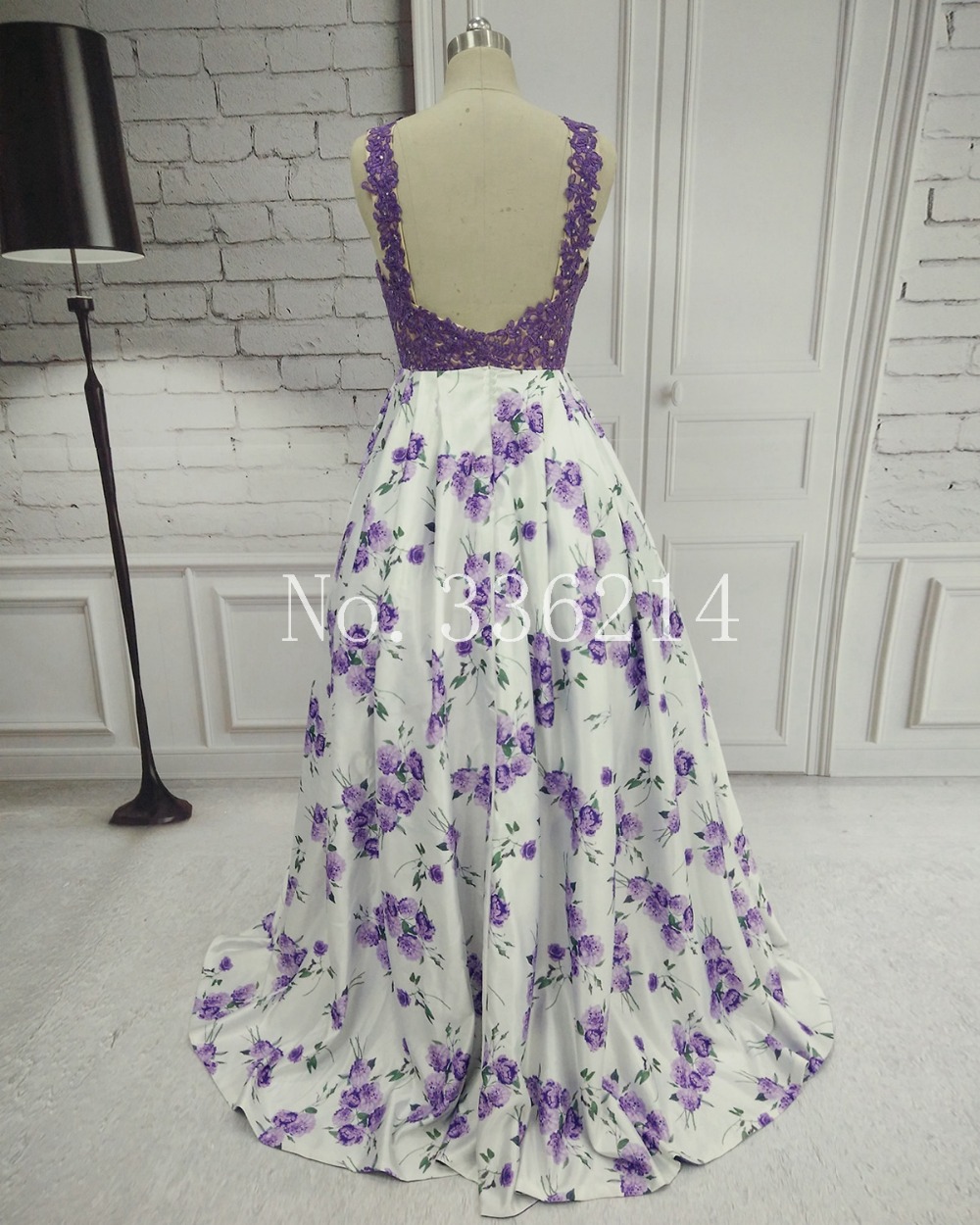 Floral Print Prom Dresses 2018 Long Lavender Keyhole Lace Applique A Line Backless Formal Party Gown, 723