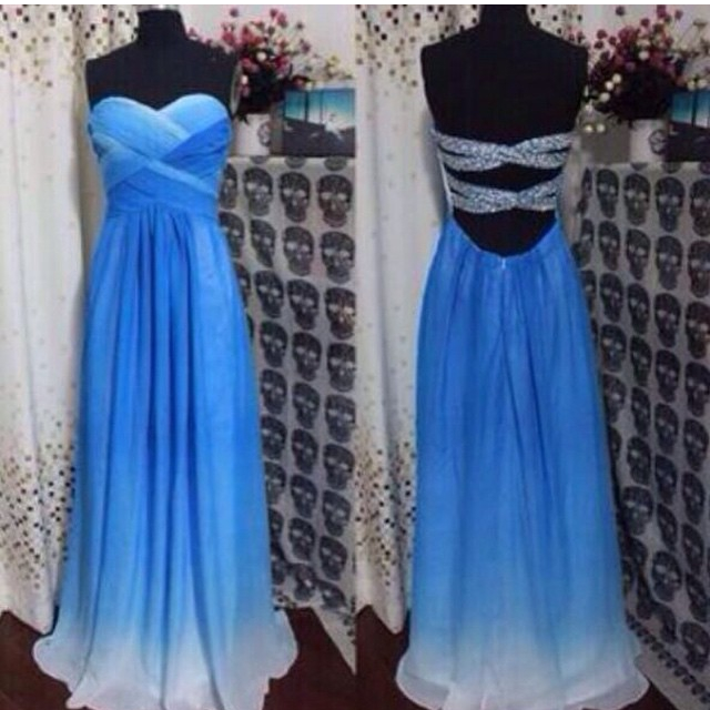 Blue Chiffon Sweetheart Formal Gown With Open Back, Off the shoulder Ombre Prom Dresses,725
