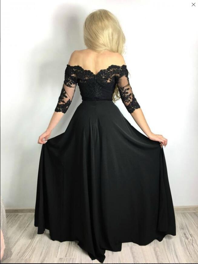 Black Off Shoulder Lace Prom Dress,Chiffon Ball Dress with Slit Side,833