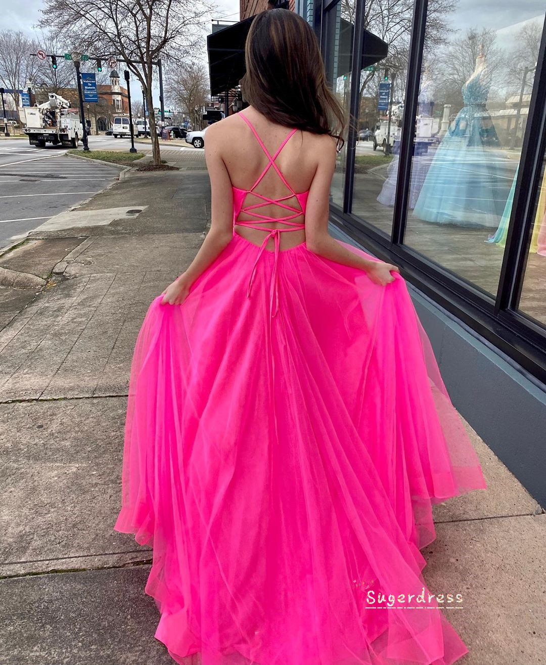 Lace-Up Hot Pink Long Prom Dress,Spaghetti Straps Party Dresses,Cheap Prom Dresses,922