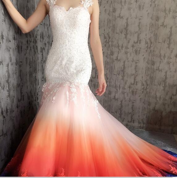 Spaghetti straps Appliques Mermaid Wedding Dress, Beaded Colored Ombre Wedding Dresses, Modern Wedding Dress, Unique Bridal Gowns, 344