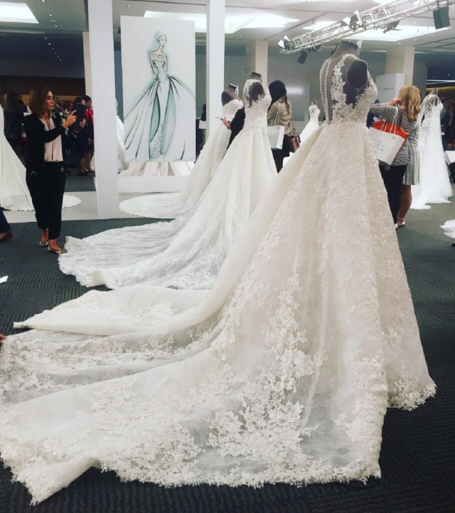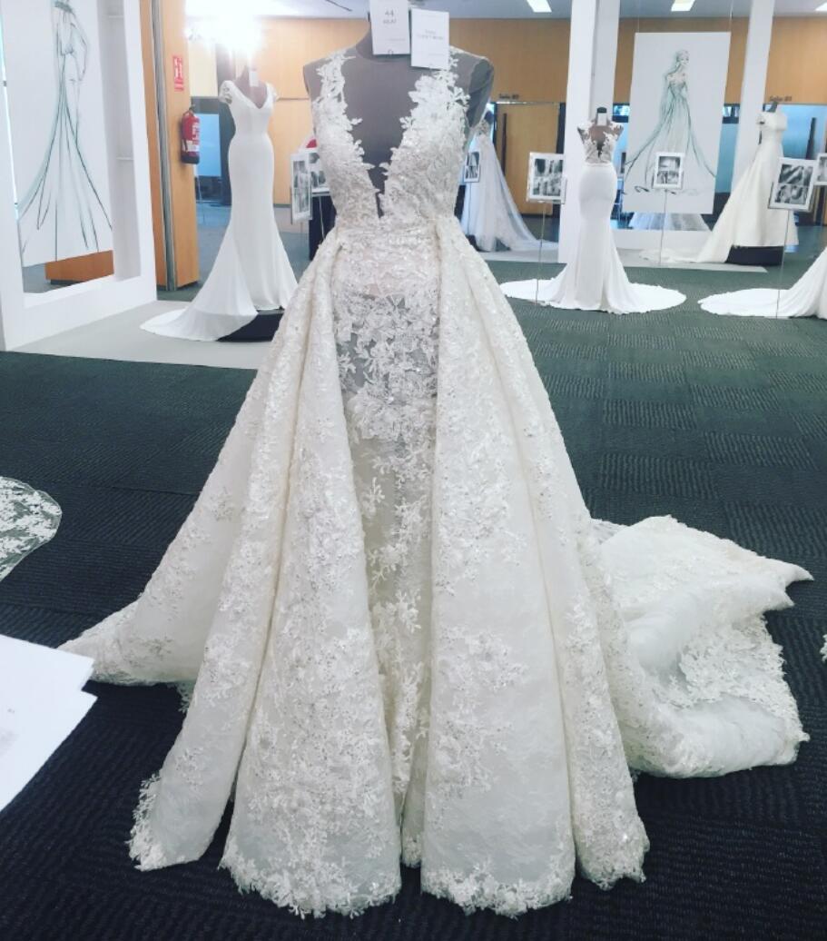 A-line Luxury Full Lace V Neck Long Train Wedding Dress,Detachable Skirt Wedding Dress,814