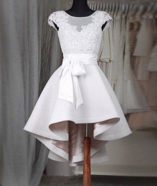 White Appliques Short Prom Dress, Cap Sleeves Satin Homecoming Dress,Party Cocktail Dresses, 016