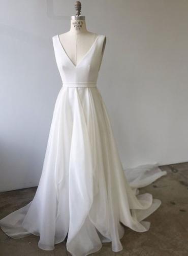 White Tulle V Neck Long Prom Dress, White Evening Dress, 565