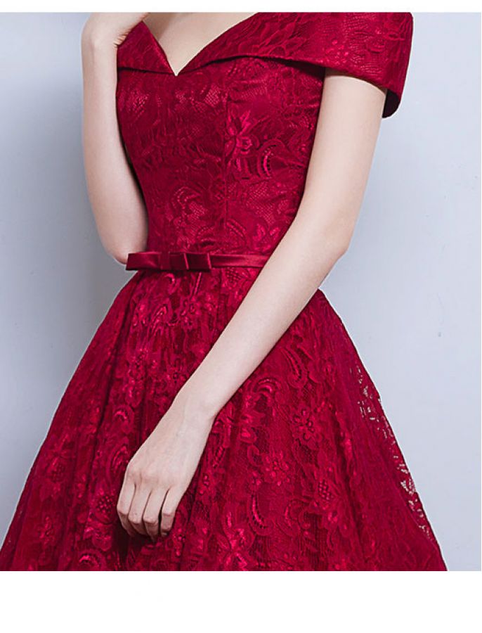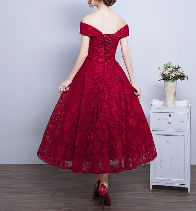 Red Off The Shoulder Party Dress,Tea Length Lace Homecoming Dress,907