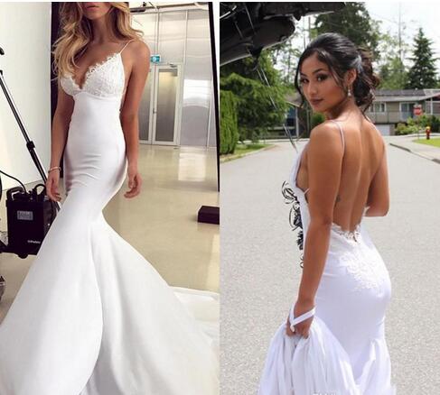 White/Ivory Spaghetti straps V neck Wedding Dress, Backless Lace Mermaid Wedding Dresses with Train, Bridal Gowns, Romantic Wedding Gowns, 155