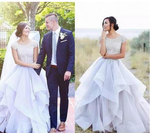 Grey Cap Sleeves Lace Prom Dress, Ruffles Organza Prom Dresses, Wedding Party Dress, Evening Party Gowns, 345
