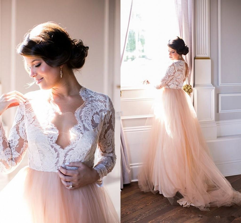 Blush Long Sleeves Wedding Dress, Lace Tulle Wedding Dresses, Vintage Wedding Dress, Bridal Gowns, 384
