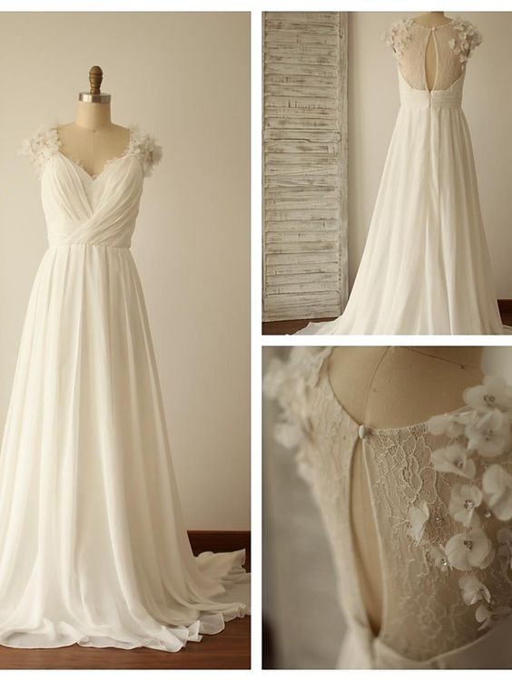 Simple Pleat Lace Wedding Dress with Train, V neck Chiffon Wedding Dresses, Modern Beach Wedding Dresses, Bridal Gowns, 427