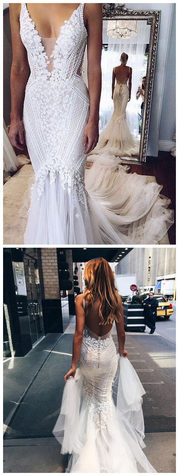 White Spaghetti straps Mermaid Wedding Dresses, Lace Backless Wedding Gown with Train, 451