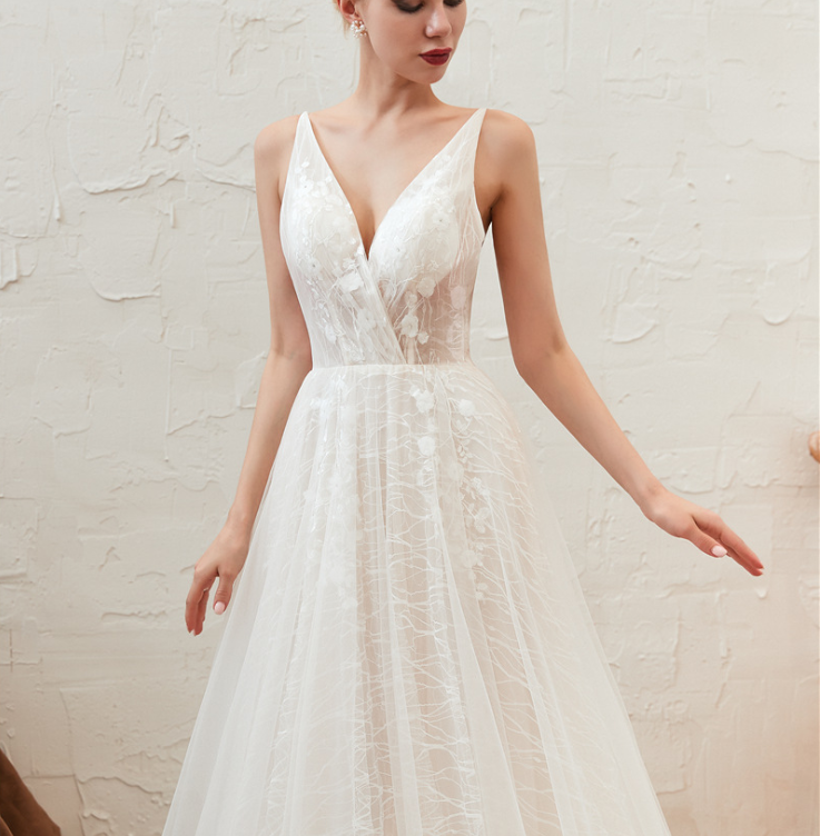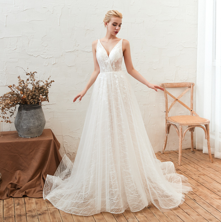 Ivory Spaghetti straps V neck Wedding Dress, Lace Backless Wedding Dresses with Train, Bridal Gowns, Tulle Wedding Gowns, 622