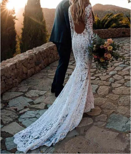 Mermaid Long Sleeve Lace Beach Wedding Dresses Backless V Neck Boho Wedding Gowns, 643
