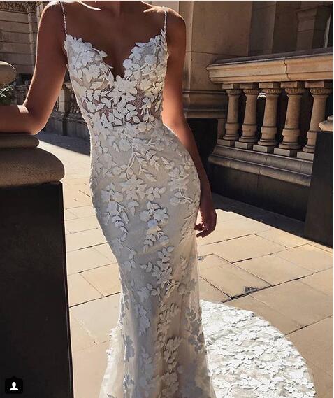 Romantic Mermaid Stunning Wedding Dresses Spaghetti Straps Delicate Lace Bridal Gowns, 765