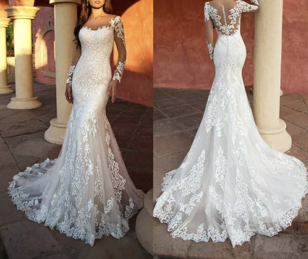 Gorgeous White Mermaid Wedding Dress Long Sleeves Lace Appliques Scoop Neck Court Train Illusion Handmade Bridal Gowns,789