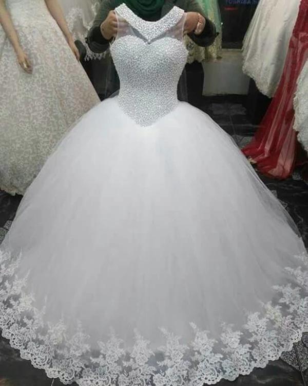 Sparkly V-Neck White Tulle Ball Gown Wedding Dresses Lace Appliques Crystals Pearls Beaded Wedding Dresses Sweep Train Bridal Gowns Online,839